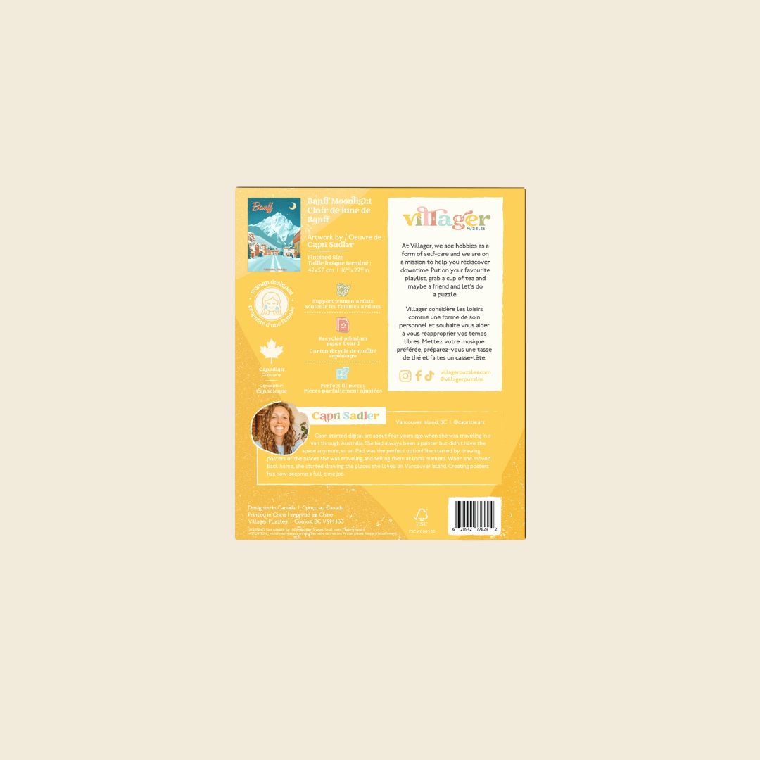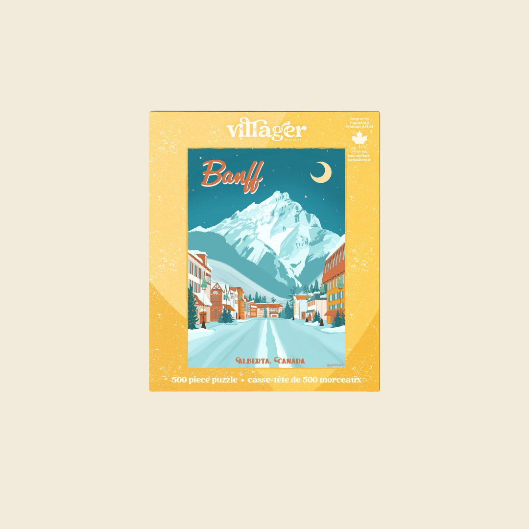 - This beautifully-illustrated travel poster style puzzle of Banff, Alberta shows the town and mountains at night. Pairs with winter and outdoors themed decor, prints and gifts.