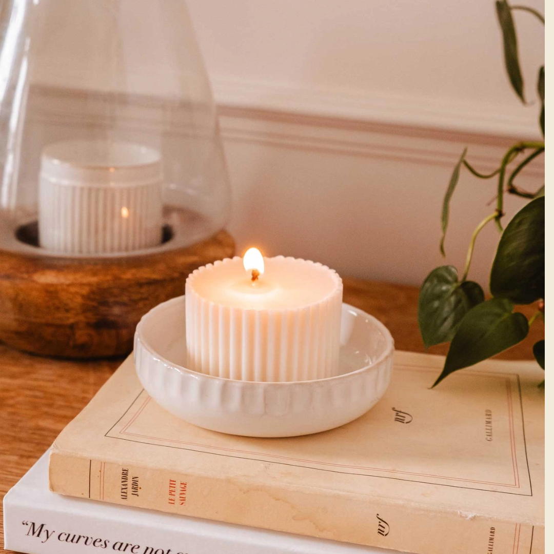 - Add a touch of charm and elegance to your space with this beautifully handcrafted ceramic plate. It's the perfect companion for our Mimi & August candle refills, transforming any moment into a cozy, warm experience.
