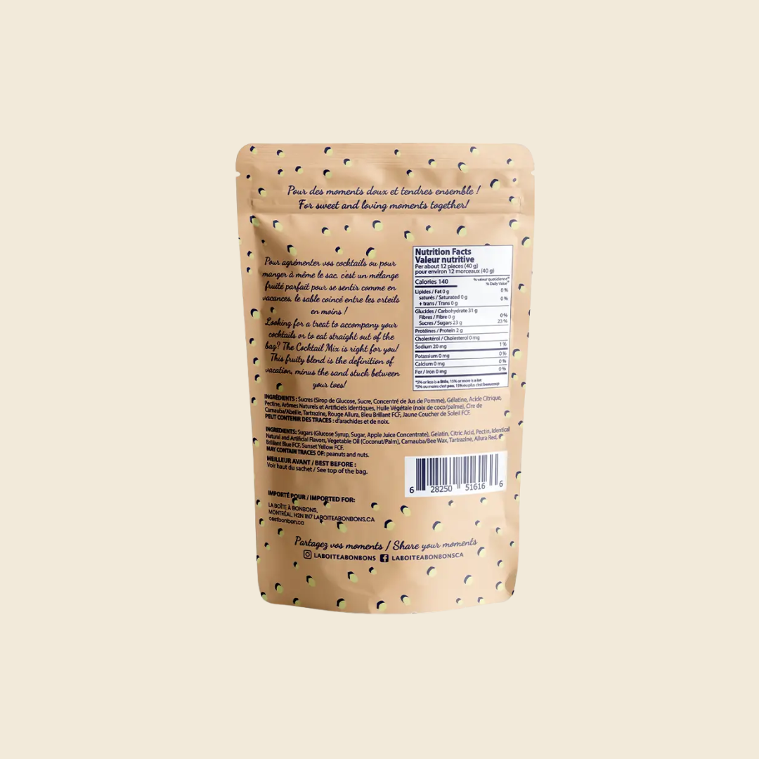 - Looking for a treat to go along your cocktails (or mocktails) or to eat straight out of the bag? We’ve got the right mix for you! In our small orange bags candies, you will find delicious fruits in the shape of strawberry, pineapple, pear, grape, lemon and clementine.
