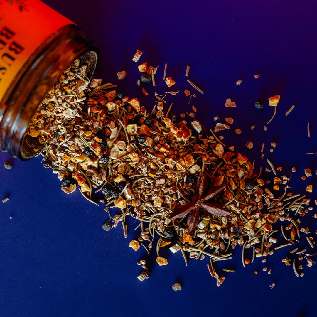 - Ingredients: SPICE BLEND (Dried ginger, rosemary, turmeric, peppercorn, astragalus, orange peel, star anise, cayenne) to be combined with fresh garlic, jalapeño, lemon, and onion.