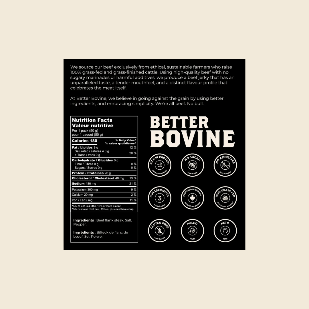 - Mouthwatering beef jerky made from 100% grass-fed, wagyu flank steak. Using only three ingredients (beef + salt + pepper), this healthy and delicious snack is slowly dehydrated and rendered to perfection. Real food made from real ingredients that can be enjoyed by everyone.