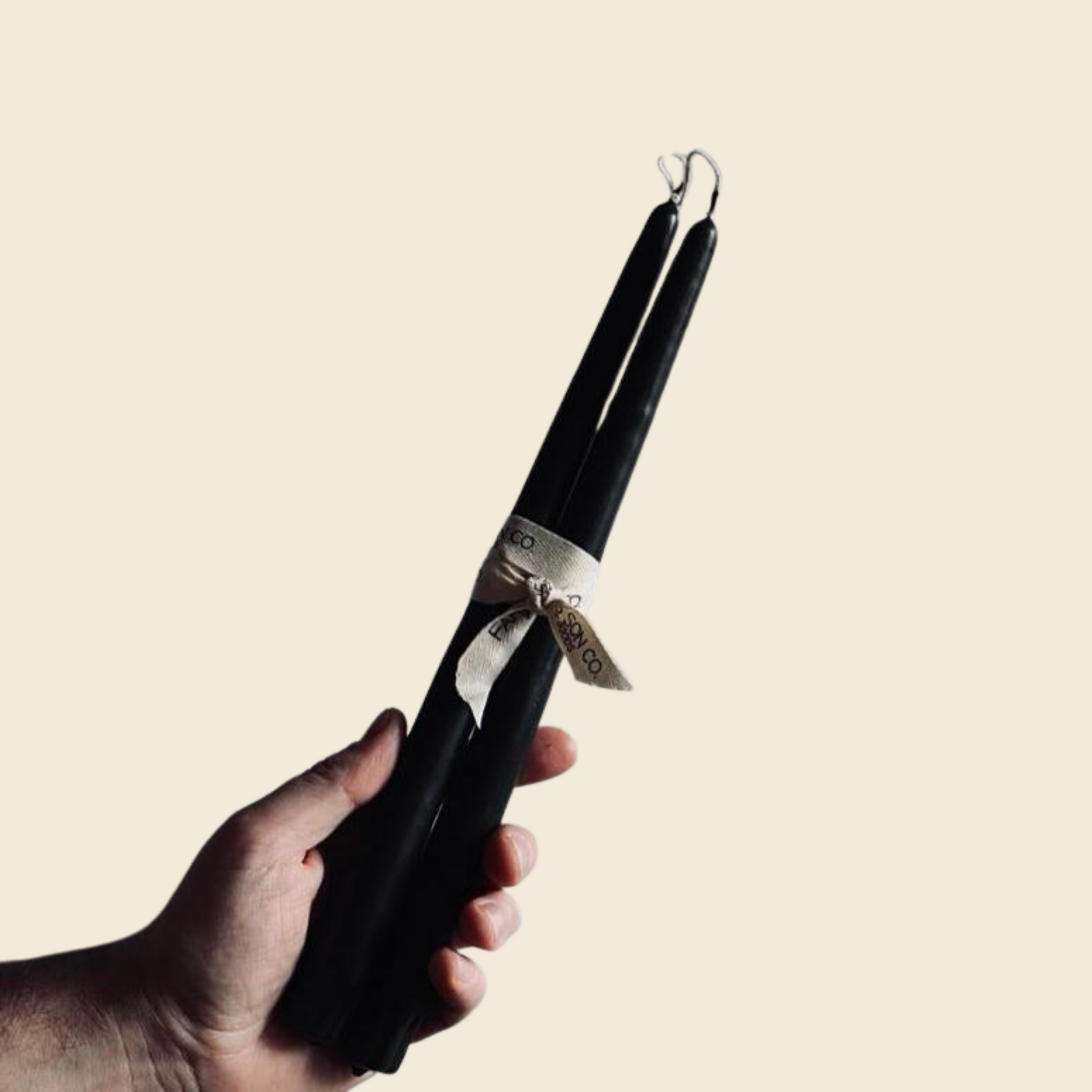 - Set of two 12 inch taper candles wrapped in Farmer's Son Co. ribbon
